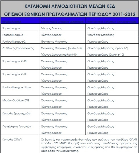 «Η Κεντρική Επιτροπή Διαιτησίας κατά τη σημερινή της συνεδρίαση προχώρησε στις ακόλουθες αλλαγές στην κατανομή αρμοδιοτήτων των μελών της, σε ό,τι αφορά τους ορισμούς διαιτητών και παρατηρητών διαιτησίας Εθνικών Πρωταθλημάτων 2011-2012, έως το τέλος της περιόδου.