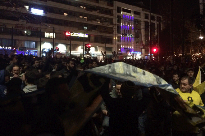 Το μοναδικό απρόοπτο του συλλαλητηρίου των οπαδών της «Ένωσης» έλαβε χώρα στα Άνω Πατήσια, όταν πριν την έναρξη της πορείας οπαδοί έβαλαν φωτιά σε ένα εκλογικό περίπτερο του ΣΥΡΙΖΑ.