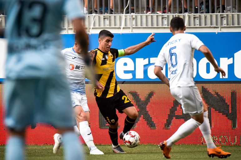Μία έκπληξη επεφύλασσε ο Μιγκέλ Καρντόσο στο αρχικό σχήμα της ΑΕΚ, δίνοντας στον Στράτο Σβάρνα το ευρωπαϊκό του ντεμπούτο και αφήνοντας στον πάγκο τον Μάριο Οικονόμου. Παράλληλα, επιβεβαίωσε το αναμενόμενο τοποθετώντας στην κορυφή της επίθεσης τον Βίκτωρα Κλωναρίδη, αντί του Μάρκο Λιβάγια. Όμως, ο τραυματισμός του Κλωναρίδη έφερε τον Κροάτη σχετικά νωρίς στο γήπεδο και η παρουσία του αποδείχθηκε καταλυτική. Ήταν αυτός ο οποίος στο 60΄ έβγαλε «μαγική» ασίστ στον Μάνταλο και ο αρχηγός με έξοχη κεφαλιά άνοιξε το σκορ.