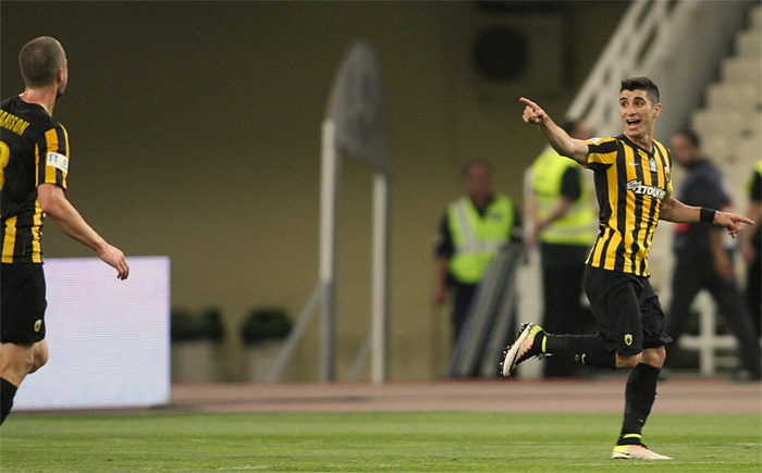 Από την άλλη, η ΑΕΚ κράτησε πιο παθητικό ρόλο και έδειξε να ψάχνει την κατάλληλη στιγμή για να σκοράρει, έχοντας στόχο να κρατήσει το μηδέν στην άμυνα. Από το 30’ και μετά ισορρόπησε το παιχνίδι και μάλιστα κατάφερε να προηγηθεί πριν ολοκληρωθεί το πρώτο μέρος. Στο 39’ ο Βάργκας έβγαλε εξαιρετική σέντρα στην καρδιά της άμυνας του Ολυμπιακού και ο Μάνταλος που έσπασε το τεχνικό οφσάιντ, βρέθηκε αμαρκάριστος μπροστά από τον Ρομπέρτο και με κεφαλιά άνοιξε το σκορ.