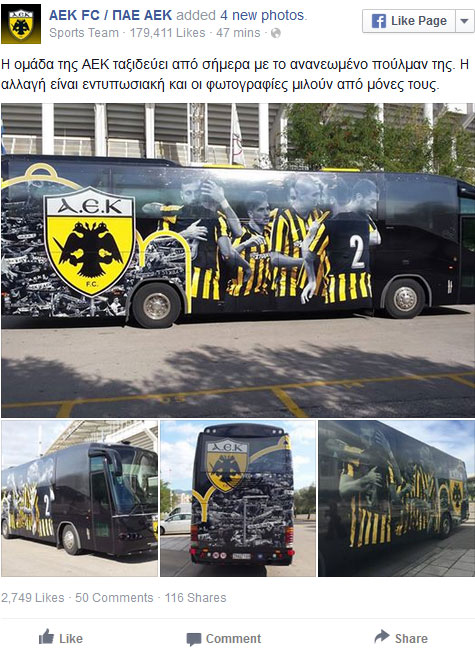Πλέον το κιτρινόμαυρο πούλμαν έχει ανανεωθεί και το «ερχόμαστε» αντικαταστάθηκε από μια φωτογραφία των ποδοσφαιριστών της «Ένωσης» που πανηγυρίζουν, από το σήμα και από τον κόσμο της ομάδας.