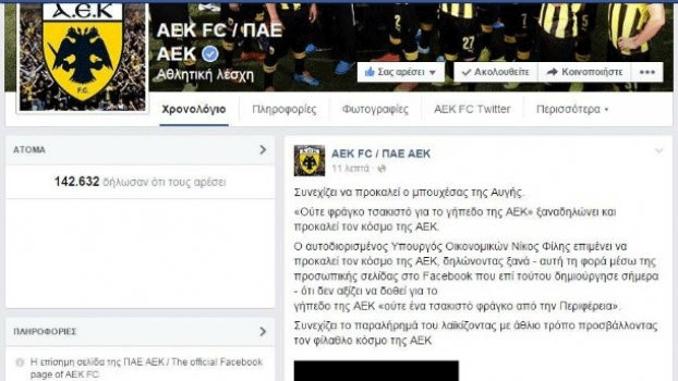 «Συνεχίζει να προκαλεί ο μπουχέσας της Αυγής. “Ούτε φράγκο τσακιστό για το γήπεδο της ΑΕΚ” ξαναδηλώνει και προκαλεί τον κόσμο της ΑΕΚ. Ο αυτοδιορισμένος Υπουργός Οικονομικών Νίκος Φίλης επιμένει να προκαλεί τον κόσμο της ΑΕΚ, δηλώνοντας ξανά – αυτή τη φορά μέσω της προσωπικής σελίδας στο Facebook που επί τούτου δημιούργησε σήμερα – ότι δεν αξίζει να δοθεί για το γήπεδο της ΑΕΚ “ούτε ένα τσακιστό φράγκο από την Περιφέρεια”. Συνεχίζει το παραλήρημά του λαϊκίζοντας με άθλιο τρόπο προσβάλλοντας τον φίλαθλο κόσμο της ΑΕΚ», ανέφερε χαρακτηριστικά το «κιτρινόμαυρο» ποστ.