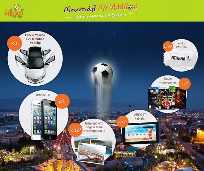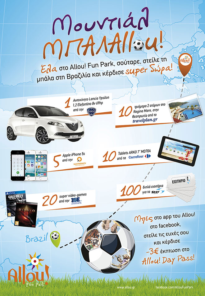 Από 14 Ιουνίου έως και τις 13 Ιουλίου στέλνεις τις ευχές σου στην Βραζιλία: μπαίνεις στο ειδικό app στη fan page του Allou! στο facebook, (https://apps.facebook.com/balallouapp/) διαλέγεις την ευχή και το μήνυμα που θέλεις να στείλεις και αυτόματα κερδίζεις 3€ έκπτωση στο Allou! Day Pass! Μετά έρχεσαι στο πάρκο για να παίξεις και παράλληλα να στείλεις τη μπάλα στη Βραζιλία: στο stand “Μουντιάλ ΜΠΑΛΑllou!” σουτάρεις τη μπάλα, τη βλέπεις να μετακινείται πάνω στο διαδραστικό χάρτη με προορισμό τη Βραζιλία και μπαίνεις στην κλήρωση για τα super δώρα! Ένα αυτοκίνητο Lancia Ypsilon 1.2 Elefantino 8v 69hp, 10 τριήμερα all inclusive στο Regina Mare στη Θεσπρωτία από το Travel Plan, 5 Iphone 5s από την Q Electronics, 10 tablets ARKO 7’’ MD704A, WiFi, 3G, Dual Sim από το Carrefour, 20 video games και 100 διπλά εισιτήρια για τα STER Cinemas