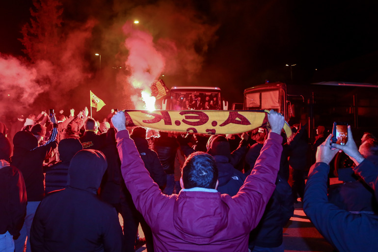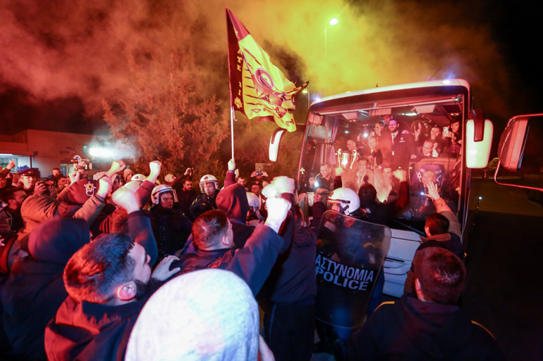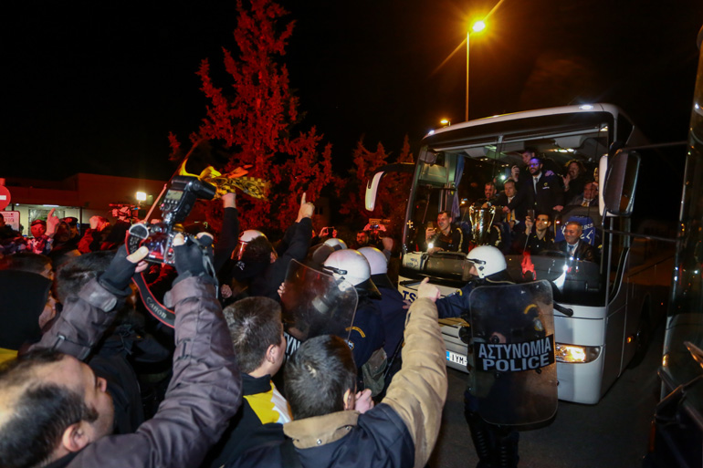 Με τη βοήθεια της Αστυνομίας, το πούλμαν της ΑΕΚ αποχώρησε από το «Ελευθέριος Βενιζέλος» λίγα λεπτά αργότερα.