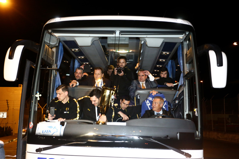Η αποστολή της ΑΕΚ έφτασε στην Αθήνα λίγο πριν τα μεσάνυχτα της Κυριακής και αποθεώθηκε από 300 φίλους της ομάδας. Οι οπαδοί πανηγύρισαν την κατάκτηση του Κυπέλλου Ελλάδας στο μπάσκετ μετά τον τελικό με τον Προμηθέα Πάτρας και αποθέωσαν τον MVP Νίκο Ζήση.