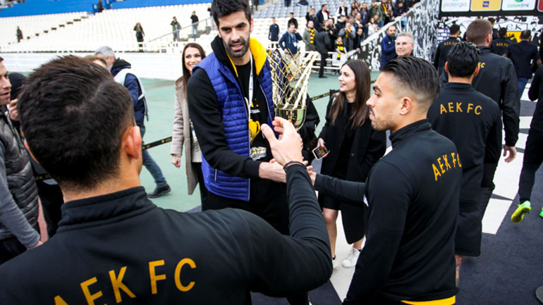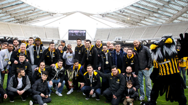 Την αποθέωση γνώρισαν οι πρωταγωνιστές της κατάκτησης του Κυπέλλου Ελλάδας μπάσκετ στο Ολυμπιακό Στάδιο, πριν την έναρξη του ποδοσφαιρικού αγώνα ΑΕΚ-Ξάνθη για την 22η αγωνιστική της Super League.