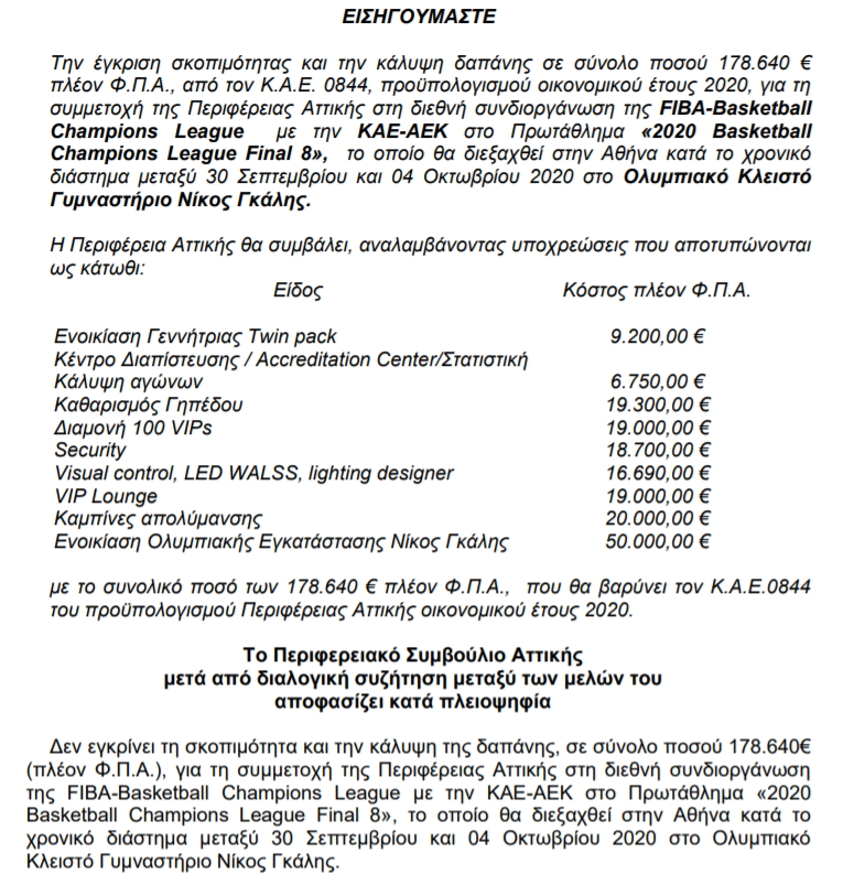 Κι αυτό γιατί, όπως ανακοινώθηκε από την Περιφέρεια Αττικής, με ψήφους 50-44 το περιφερειακό συμβούλιο καταψήφισε το κονδύλι ύψους 178.640 ευρώ, που προοριζόταν για τη διοργάνωση στο ΟΑΚΑ.