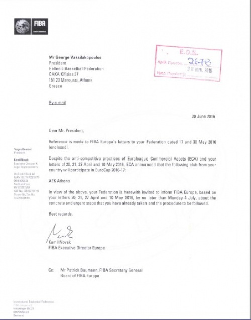 Η αναφορά γίνεται σε σχέση με τις επιστολές της FIBA Ευρώπης στην ομοσπονδία σας από τις 17 και 30 Μαρτίου 2016. Παρά τις ενάντιες στον ανταγωνισμό πρακτικές της ECA και τις δικές σας επιστολές από τις 20, 21, 27 Απριλίου και 10 Μαϊου 2016, η ECA ανακοίνωσε ότι το εξής σωματείο από τη χώρα σας, θα συμμετάσχει στο Eurocup 2016-17: ΑΕΚ.
