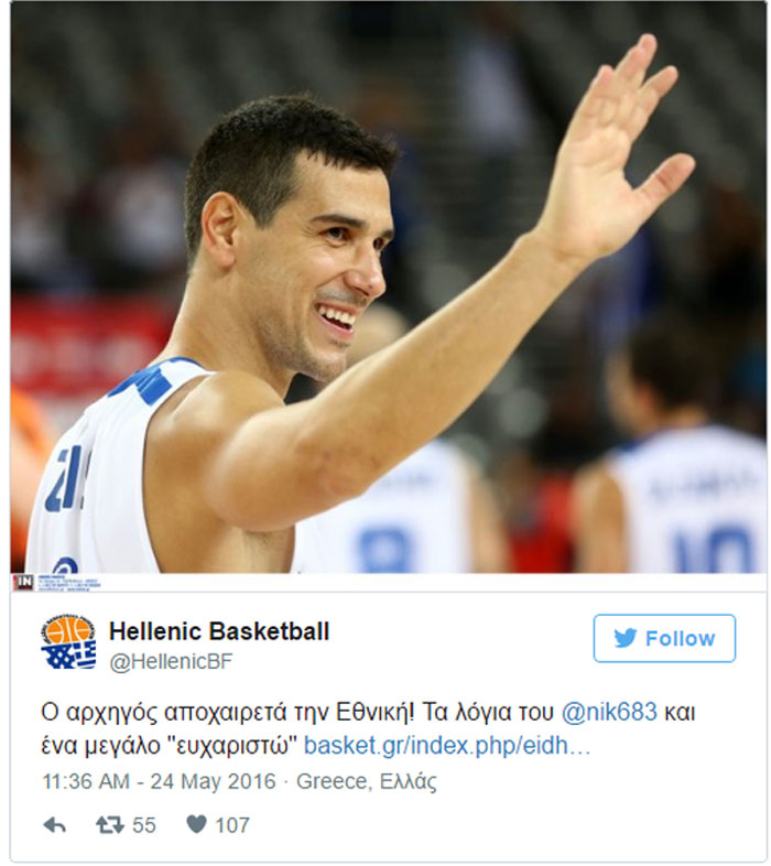 «Πήρε την πιο δύσκολη απόφαση της επαγγελματικής του καριέρας. Έπαιξε για την Ελλάδα 17 σερί καλοκαίρια, επίδοση ρεκόρ για Ευρωπαίο παίκτη!» αναφέρει μεταξύ άλλων το αφιέρωμα.