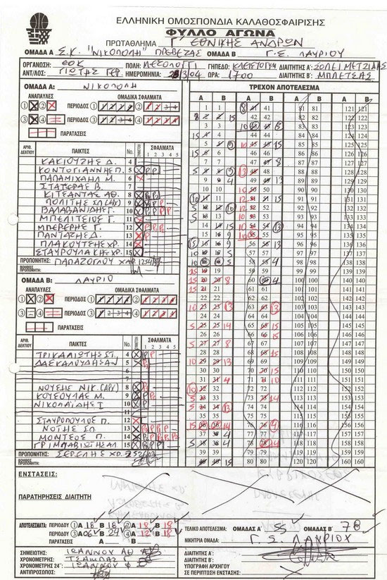 Το φύλλο αγώνα της αναμέτρησης Νικόπολη Πρέβεζας – Λαύριο 55-78 στις 28 Μαρτίου 2004. Είναι το πρώτο ματς του Χρήστου Σερέλη ως πρώτου προπονητή των «Μεταλλωρύχων».