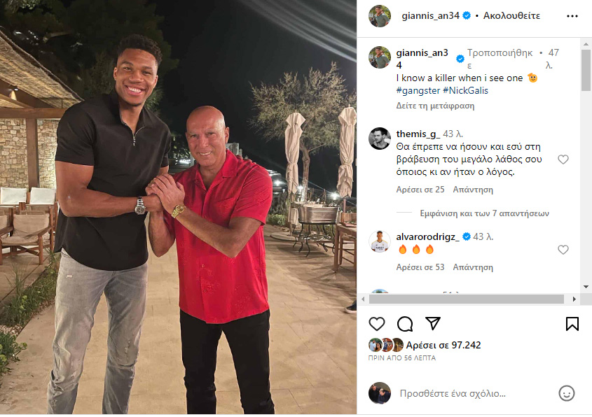 Πιο συγκεκριμένα ο Έλληνας αστέρας του ΝΒΑ πόσταρε στα social media μία φωτογραφία του με τον «Γκάνγκστερ», γράφοντας: «Αναγνωρίζω έναν… δολοφόνο όταν τον βλέπω».