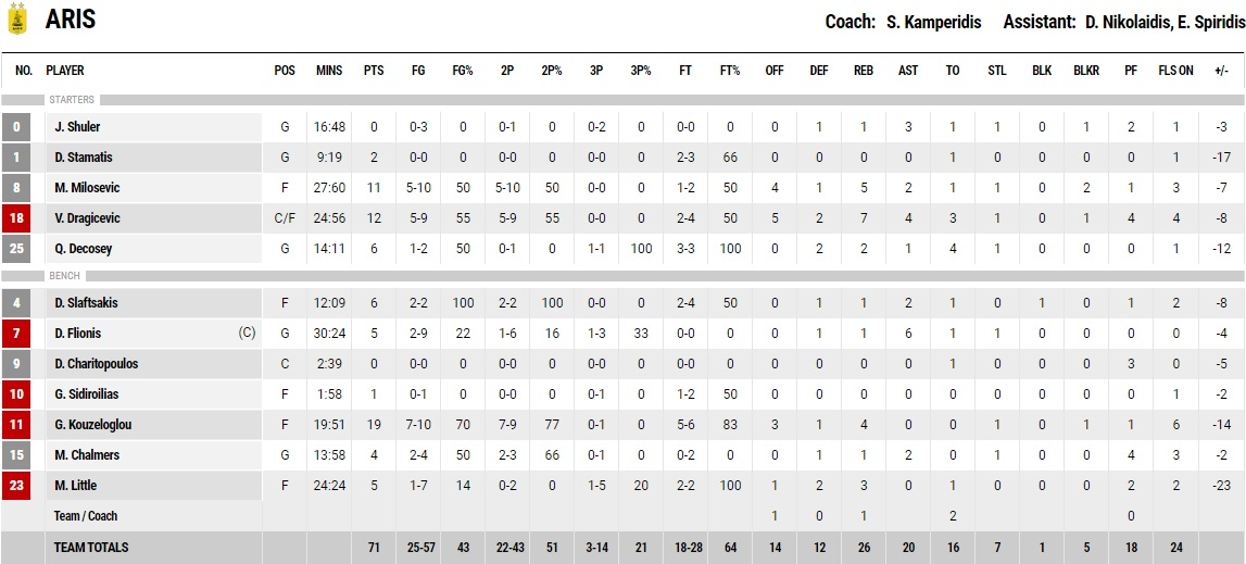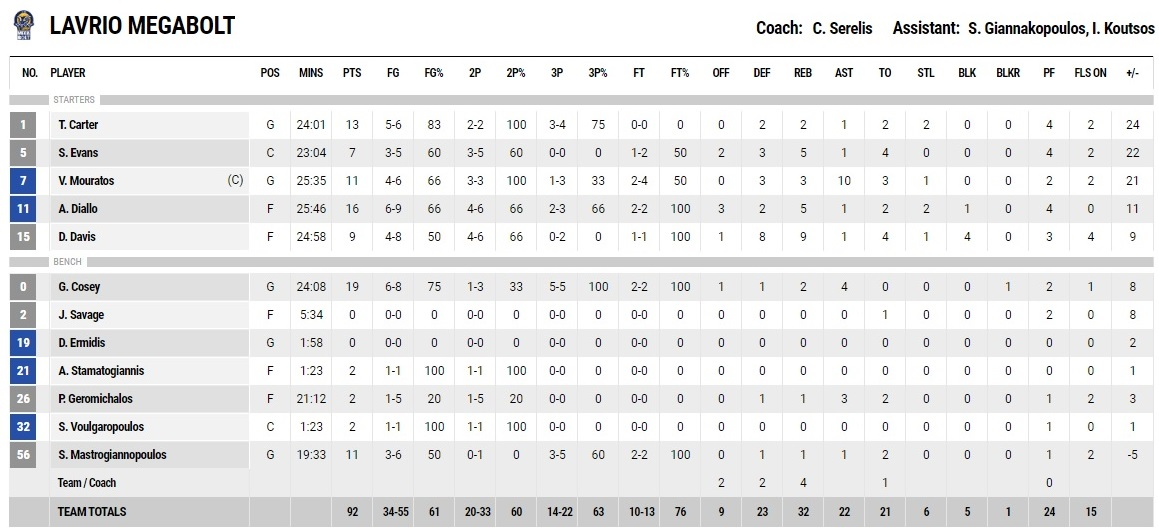 Κορυφαίοι παίκτες από το Λαύριο ήταν οι Κόζι και Ντιαλό με 19 και 16 πόντους αντίστοιχα, ενώ από τον Άρη που πλέον έχει ρεκόρ 2-2, ξεχώρισε ο Κουζέλογλου με 19 πόντους.