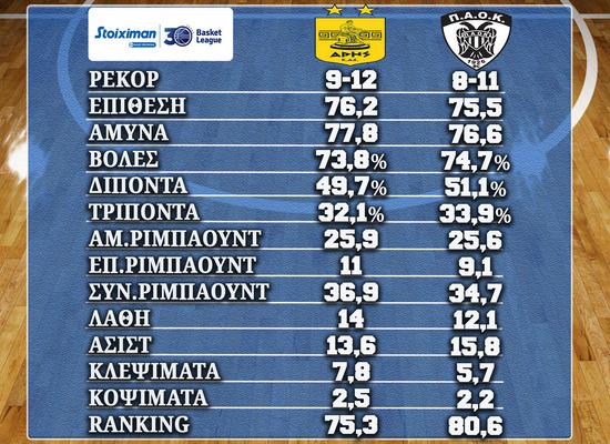 – Κατά 2,5 ριμπάουντ μειώνεται η επίδοση του Άρη όταν αγωνίζεται ως γηπεδούχος αφού μαζεύει 35,6 έναντι των 38,1 που έχει ως φιλοξενούμενος.