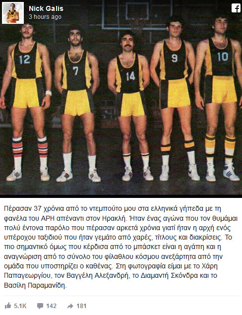 «Πέρασαν 37 χρόνια από το ντεμπούτο μου στα ελληνικά γήπεδα με τη φανέλα του ΑΡΗ απέναντι στον Ηρακλή. Ήταν ένας αγώνα που τον θυμάμαι πολύ έντονα παρόλο που πέρασαν αρκετά χρόνια γιατί ήταν η αρχή ενός υπέροχου ταξιδιού που ήταν γεμάτο από χαρές, τίτλους και διακρίσεις. Το πιο σημαντικό όμως που κέρδισα από το μπάσκετ είναι η αγάπη και η αναγνώριση από το σύνολο του φίλαθλου κόσμου ανεξάρτητα από την ομάδα που υποστηρίζει ο καθένας. Στη φωτογραφία είμαι με το Χάρη Παπαγεωργίου, τον Βαγγέλη Αλεξανδρή, το Διαμαντή Σκόνδρα και το Βασίλη Παραμανίδη».