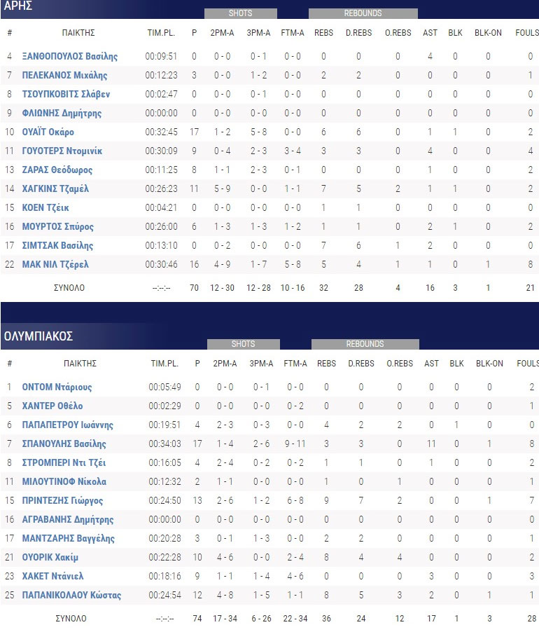 Ο Βασίλης Σπανούλης με 17 πόντους και 11 ασίστ ήταν από τους βασικούς συντελεστές της νίκης, ενώ από την πλευρά του Άρη ο Γουάιτ είχε 17 πόντους με 5 τρίποντα.