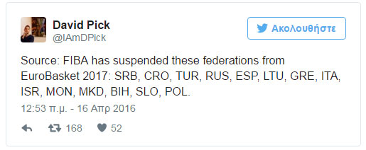 Ο Ισραηλινός δημοσιογράφος, Ντέιβιντ Πικ, έχει πληροφορίες ότι οι ομοσπονδίες της Σερβίας, της Κροατίας, της Τουρκίας, της Ρωσίας, της Ισπανίας, της Λιθουανίας, της Ελλάδας, της Ιταλίας, του Ισραήλ, του Μαυροβουνίου, της FYROM, της Βοσνίας, της Σλοβενίας και της Πολωνίας έλαβαν επιστολή από τη FIBA πως οι Εθνικές τους ομάδες αποκλείστηκαν από όλες τις διοργανώσεις!