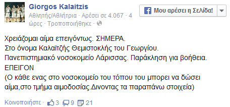 Έκκληση για αίμα έκανε ο παλαίμαχος διεθνής μπασκετμπολίστας, Γιώργος Καλαϊτζής για τον πατέρα του, ο οποίος βρισκεται στο νοσοκομείο Λάρισας...
