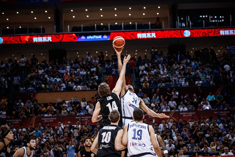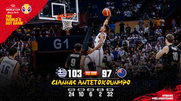 Η Ελλάδα επικράτησε στη Ναντζίνγκ 103-97 τη Νέας Ζηλανδίας και με δύο νίκες προκρίθηκε από τον 6ο όμιλο στους «16» του Παγκοσμίου Κυπέλλου μαζί με την Βραζιλία που «καθάρισε» με τρεις νίκες.