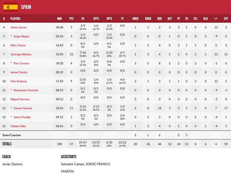 Κορυφαίοι για τους Ίβηρες ήταν οι Σαντιάγκο Αλντάμα με 23 πόντους και Ουσμάν Γκαρούμπα με 11 πόντους, 14 ριμπάουντ και 4 τάπες. Ο Μουσταφά Κουρτουντλούμ είχε 19 πόντους για την Τουρκία.