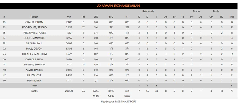 Ωστόσο, υπολόγιζε χωρίς τον Σέιβον Σιλντς, ο οποίος σήκωσε στις… πλάτες του την Αρμάνι, την οδήγησε στην ανατροπή και τελικά στη νίκη με 73-66. Ο 27χρονος φόργουορντ τελείωσε τον αγώνα με 21 πόντους και 8 ριμπάουντ, με τους 19 πόντους του να τους σημειώνει στο δεύτερο ημίχρονο. Από την Αναντολού Εφές, που τα έσπασε από τα 6.75 (8/31), ξεχώρισε ο Σέιν Λάρκιν με 19 πόντους, ενώ 18 είχε σημειώσει ο Βασίλιε Μίτσιτς πριν αποχωρήσει τραυματίας…