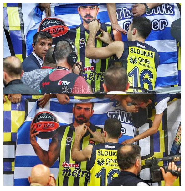 Παρά το γεγονός ότι η ελληνική σημαία δεν είναι και το πιο αγαπητό σύμβολο στην Τουρκία, οι υποστηρικτές της πρωταθλήτριας Ευρώπης κρέμασαν μια ελληνική σημαία, η οποία πάνω της είχε το πρόσωπο του Σλούκα, με τις φράσεις «γείτονας» και «μεταξένιος πασέρ». Το περιστατικό εκτυλίχθηκε κατά τη διάρκεια της αναμέτρησης με την Τόφας για τα play offs του τουρκικού πρωταθλήματος.