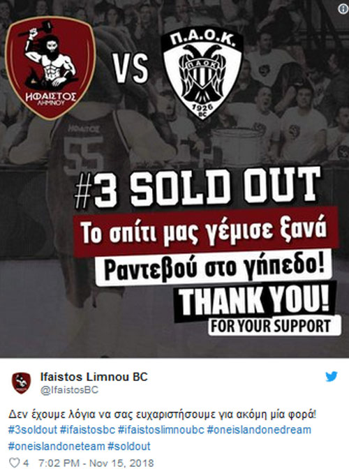 Mπάσκετ: «Sold out» το παιχνίδι Ήφαιστος Λήμνου-ΠΑΟΚ