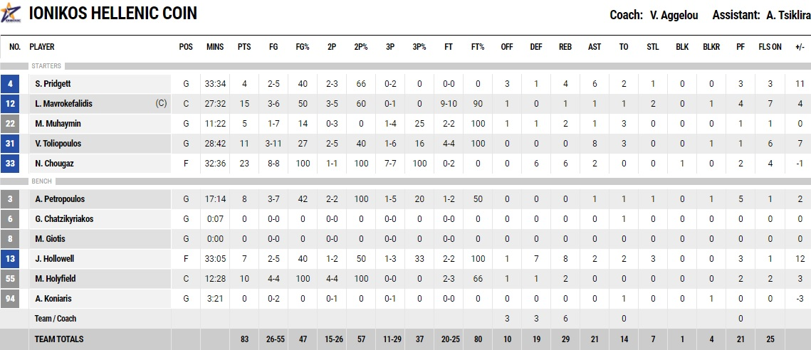Πρώτος σκόρερ των νικητών ο Νίκος Χουγκάζ με 23 πόντους και 7/7 τρίποντα, ενώ από τη Λάρισα των 18 λαθών ξεχώρισε ο Μπράντον Ρας με 18.