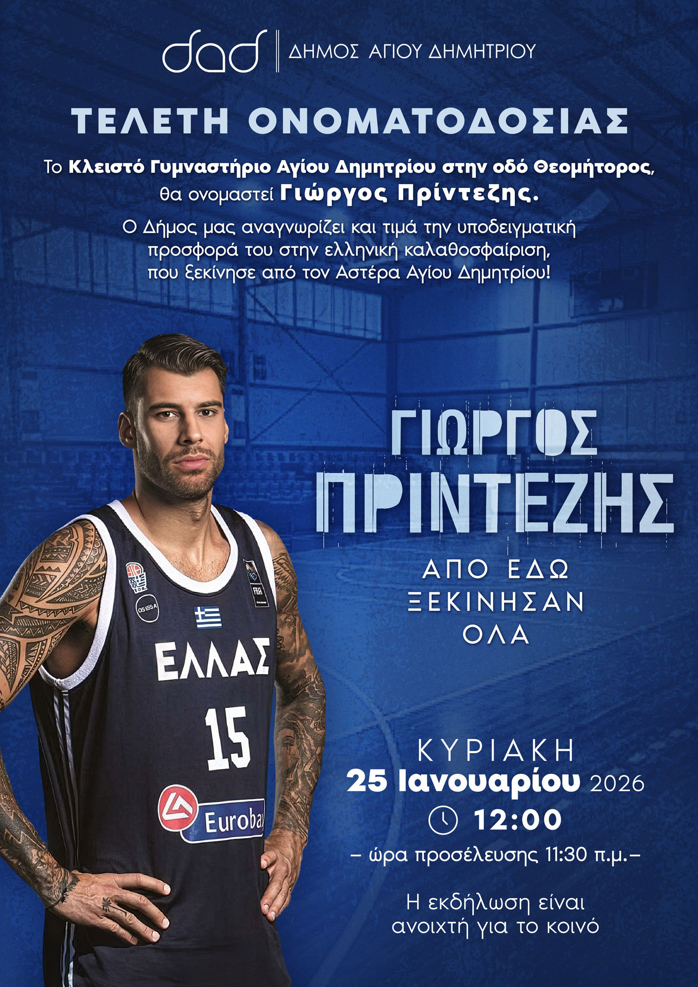Όπως τόνισε ο Δήμαρχος Αγίου Δημητρίου Στέλιος Μαμαλάκης, «η ονοματοδοσία του γυμναστηρίου αποτελεί έμπρακτη αναγνώριση της στενής σχέσης του αθλητή με την πόλη και της διαδρομής του, που ξεκίνησε από τις γειτονιές του Αγίου Δημητρίου και έφτασε στην κορυφή του ελληνικού και ευρωπαϊκού μπάσκετ».