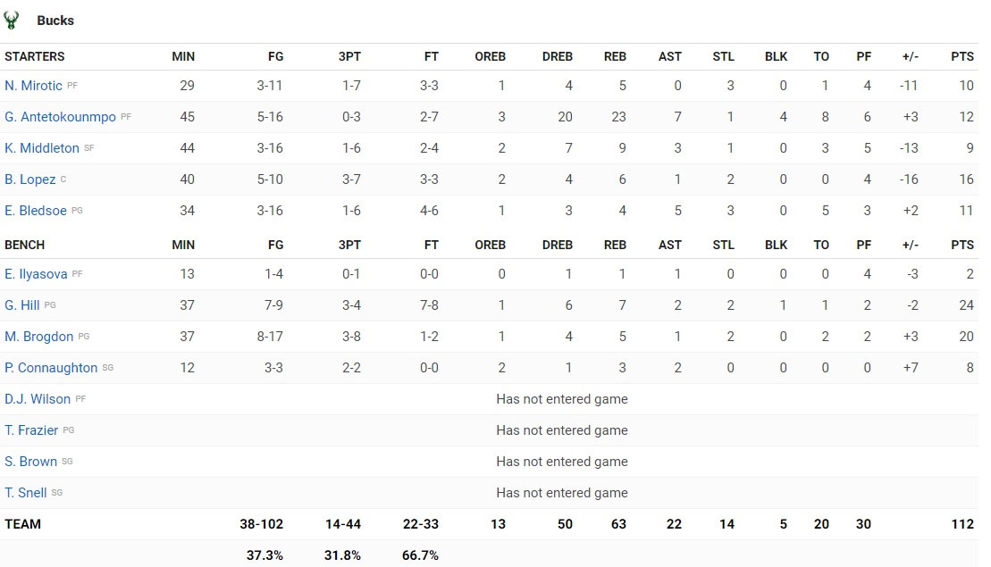 Ο Γιάννης Αντετοκούνμπο περιορίστηκε κι απορρυθμίστηκε από την άμυνα των γηπεδούχων, ενώ αποβλήθηκε στην αρχή της δεύτερης παράτασης. Ο «Greek Freak» είχε 12 πόντους με 5/13 δίποντα, 0/3 τρίποντα και 2/7 βολές, μάζεψε 23 ριμπάουντ, είχε 7 ασίστ, 4 τάπες και 1 κλέψιμο, αλλά υπέπεσε και σε 8 λάθη σε 45 λεπτά.