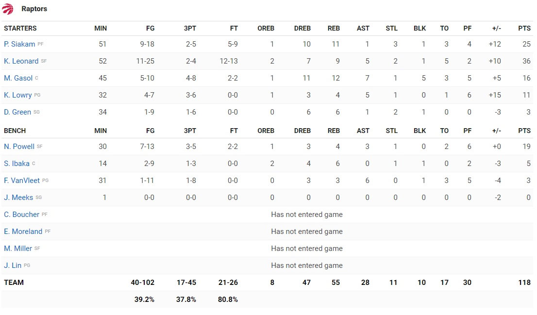 Δύο χαμένες βολές κι ένα λάθος του Γιάννη έδωσαν το δικαίωμα στους γηπεδούχους να βρεθούν στο 103-99, 1:29 πριν από το τέλος της παράτασης, όμως το Μιλγουόκι με καλάθι του Μπρόγκντον και δύο βολές του Χιλ ισοφάρισε στα 14,5’’. Ο Λέοναρντ αστόχησε στην εκπνοή και το ματς πήγε σε δεύτερο έξτρα πεντάλεπτο (103-103). Αυτό άρχισε άσχημα για τους Μπακς, καθώς με 4:24 να απομένουν ο Αντετοκούνμπο αποβλήθηκε με ένα αμφισβητούμενο έκτο φάουλ. Με ηγέτη τον Λέοναρντ το Τορόντο έφτασε στο 114-110 στα 32,4’’ και «καθάρισε» το ματς.