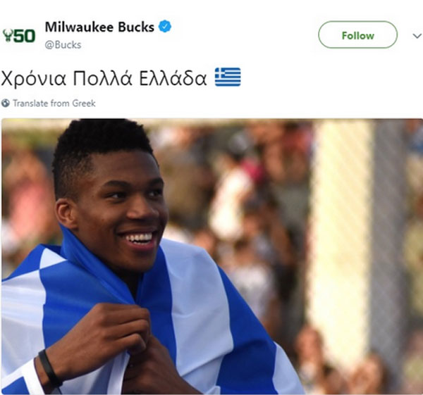 Πιο συγκεκριμένα, ένα «τιτίβισμα» γραμμένο στα ελληνικά αναρτήθηκε στον επίσημο λογαριασμό της ομάδας στο Twitter, μέσω του οποίου οι Μπακς ευχήθηκαν «Χρονια Πολλά Ελλάδα», ανήμερα της εθνικής επετείου της χώρας μας για την επανάσταση της 25ης Μαρτίου 1821.