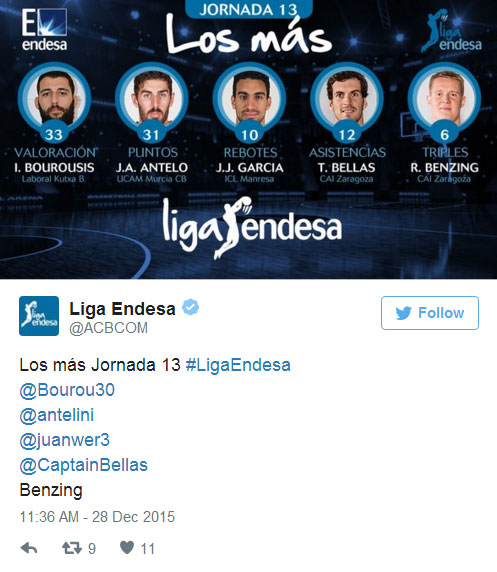 Ο Γιάννης Μπουρούσης κέρδισε για τρίτη φορά φέτος τον τίτλο του Καλύτερου Παίχτη της αγωνιστικής στην Ισπανία, μετά την εντυπωσιακή του εμφάνιση κόντρα στην Φουενλαμπράδα, αφού μάζεψε 33 βαθμούς στο σύστημα αξιολόγησης της Liga ACB.