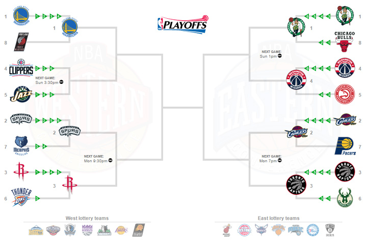 Τα 7/8 του πρώτου γύρου των πλέι οφ στο ΝΒΑ ολοκληρώθηκαν, καθώς Σέλτικς και Ουίζαρντς προκρίθηκαν στα ημιτελικά της ανατολής. Οι Κέλτες, που βρέθηκαν να χάνουν με 2-0 στη σειρά με τους Μπουλς, απάντησαν με τέσσερις νίκες και προκρίθηκαν στον δεύτερο γύρο, όπου θα αντιμετωπίσουν με πλεονέκτημα έδρας του Ουίζαρντς, οι οποίοι άφησαν εκτός συνέχειας τους Χοκς.