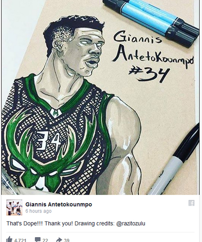Ο Γιάννης Αντετοκούνμπο έδωσε έμπνευση σε ένα fan του και μοιράστηκε μέσω του Facebook το σκίτσο που του έστειλε! Ο φόργουορντ των Μπακς δημοσίευσε το σκίτσο του, τονίζοντας ότι τέτοιες κινήσεις τού δίνουν το κίνητρο να γίνει ακόμα καλύτερος στη συνέχεια.