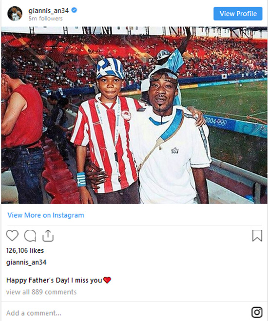 «Χαρούμενη ημέρα του Πατέρα! Μου λείπεις» έγραψε χαρακτηριστικά ο «Greek Freak», ο οποίος στη συγκεκριμένη φωτογραφία φορά τη φανέλα του Ολυμπιακού.