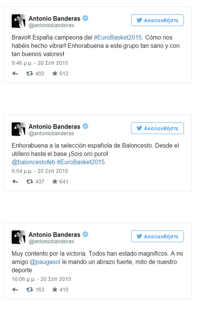 Η κατάκτηση του Ευρωμπάσκετ έκανε περήφανους όλους τους Ισπανούς παγκοσμίως. Ο Αντόνιο Μπαντέρας δεν αποτέλεσε εξαίρεση.
