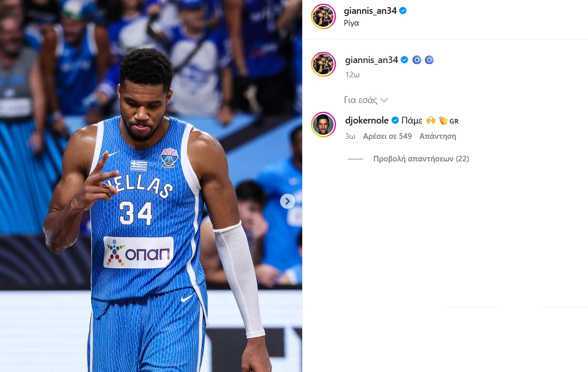 Ο Νόβακ Τζόκοβιτς, που λατρεύει το μπάσκετ και είναι δηλωμένος fan του« Greek Freak», σχολίασε στα ελληνικά «Πάμε!» κάτω από την ανάρτηση του 30χρονου σούπερ σταρ στο Instagram.
