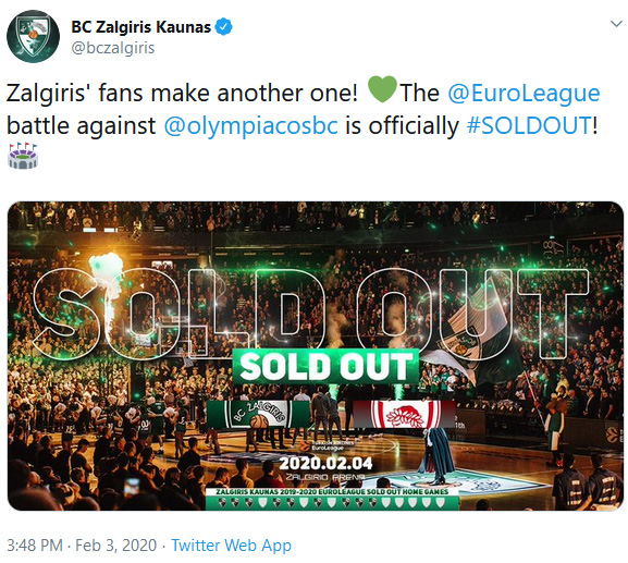Αυτό το λέμε καθώς οι Λιθουανοί μέσω των social media ανακοίνωσαν ότι εξαντλήθηκαν όλα τα εισιτήρια για τον αγώνα με τους Πειραιώτες.