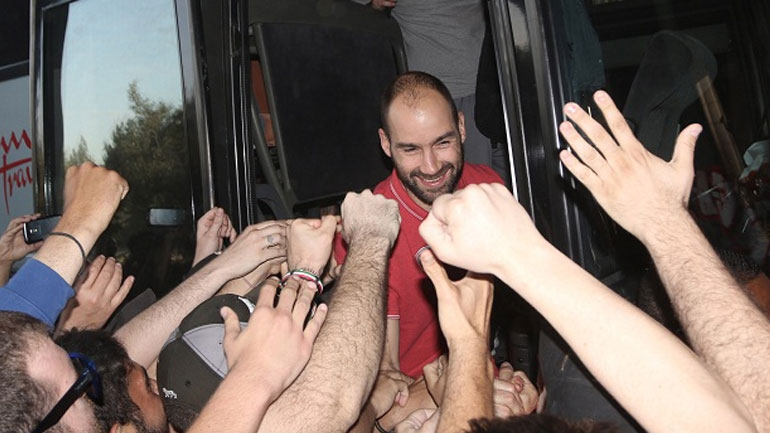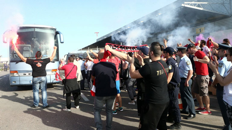 Οι οπαδοί του Ολυμπιακού χειροκρότησαν και αποθέωσαν τον Γιάννη Σφαιρόπουλο και τους παίκτες του, ενώ η… υποδοχή είχε και συνέχεια, καθώς ανάλογες εικόνες από περίπου 400-450 οπαδούς υπήρξαν και στο ΣΕΦ.