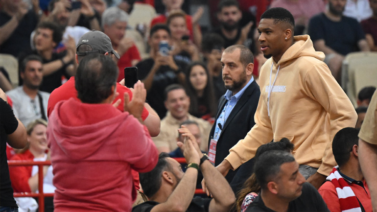 Μετά την παρουσία του στο ΟΑΚΑ, ο αστέρας των Μπακς, συνοδευόμενος από τον αδερφό του, βρέθηκε στο Στάδιο Ειρήνης και Φιλίας για να παρακολουθήσει το Game 3 των τελικών του ελληνικού πρωταθλήματος μπάσκετ, γνωρίζοντας την αποθέωση από τους φιλάθλους των Πειραιωτών.