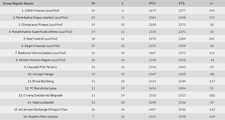 Ο Ολυμπιακός θα είναι τρίτος αν κερδίσει απόψε τη Ζαλγκίρις, ενώ θα αντιμετωπίσει τους Λιθουανούς και στα πλέι οφ. Τρίτος θα είναι και με ήττα, αν όμως παράλληλα νικήσει η Ρεάλ την Μπάμπεργκ στη Μαδρίτη. Τέταρτος θα πλασαριστεί αν χάσει από τη Ζαλγκίρις και χάσει και η Ρεάλ από την Μπάμπεργκ. Σε αυτήν την περίπτωση θα παίξει με τη «βασίλισσα», που θα είναι πέμπτη.