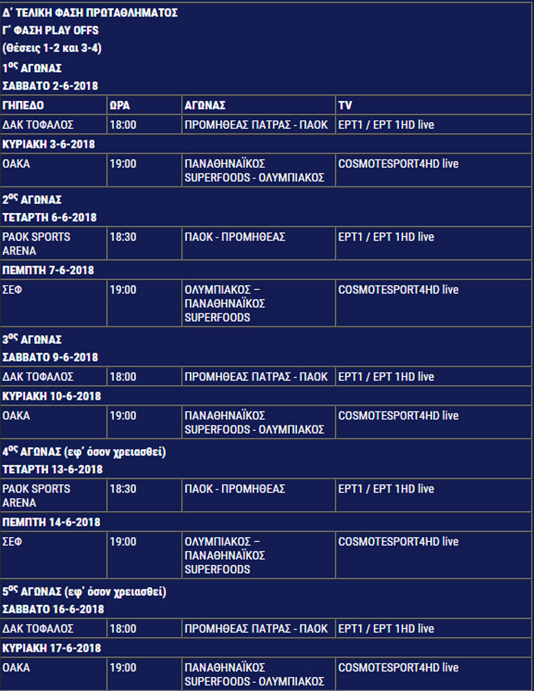 Το αγωνιστικό και τηλεοπτικό πρόγραμμα της τρίτης και τελευταίας φάσης των Play Offs (θέσεις 1-2 και 3-4) ανακοίνωσε επίσημα η διοργανώτρια αρχή του...