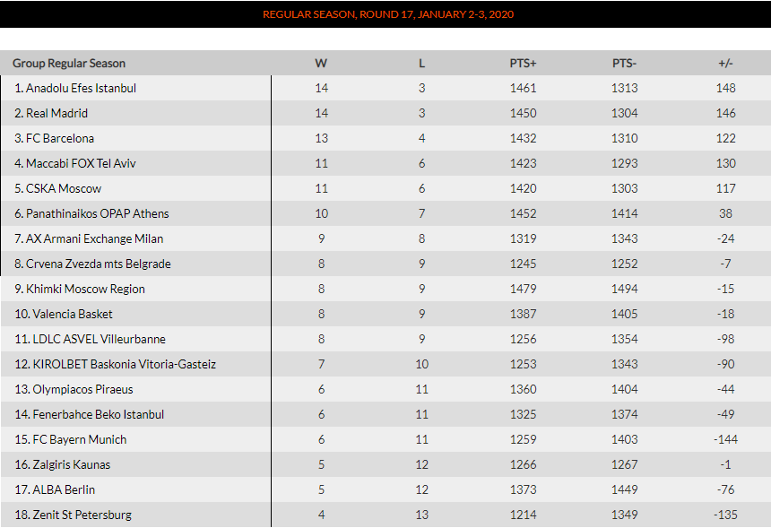 Όσον αφορά στον Ολυμπιακό, ο οποίος την Πέμπτη ηττήθηκε με 96-87 από τη Φενέρμπαχτσε στο ΣΕΦ, βρίσκεται στην 13η θέση της κατάταξης.