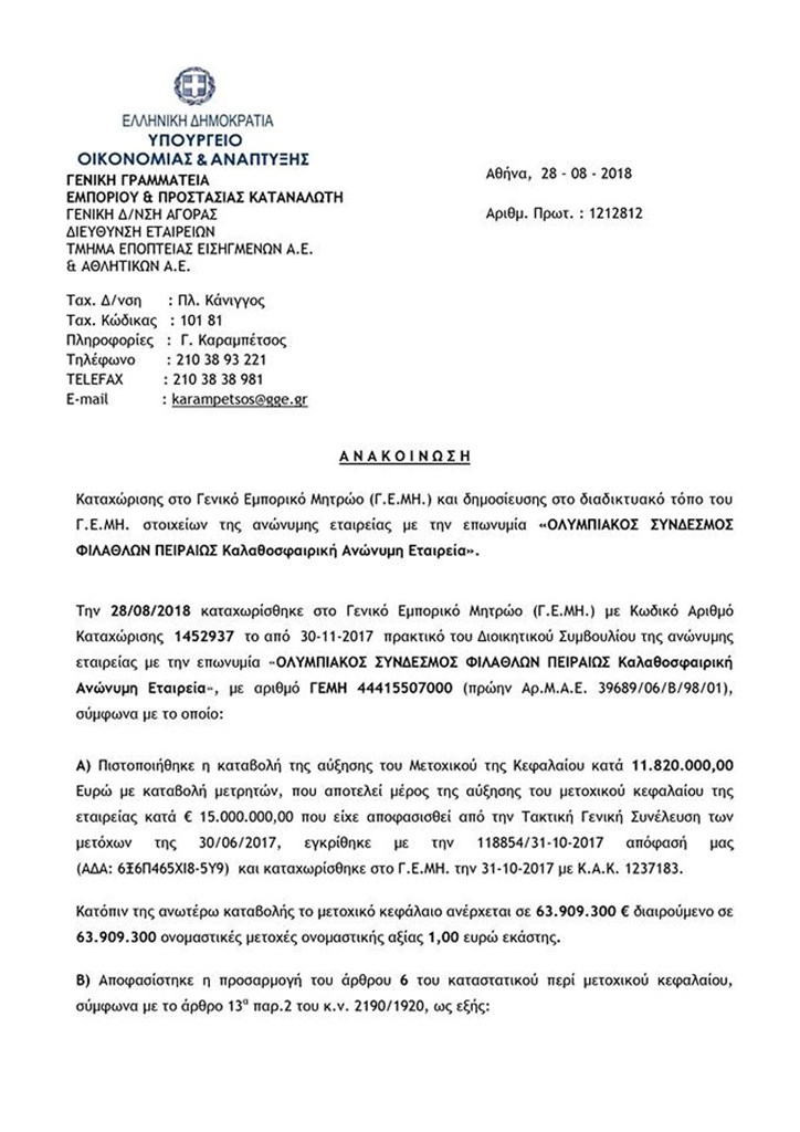 Στο έγγραφο που ανάρτησε το ΓΕΜΗ (Γενικό Εμπορικό Μητρώο) αναφέρεται: «Πιστοποιήθηκε η καταβολή της αύξησης του Μετοχικού της Κεφαλαίου κατά 11.820.000,00 Ευρώ με καταβολή μετρητών, που αποτελεί μέρος της αύξησης του μετοχικού κεφαλαίου της εταιρείας κατά 15.000.000,00 Ευρώ που είχε αποφασισθεί από την Τακτική Γενική Συνέλευση των μετόχων της 30/06/2017» ενώ συνεχίζει πως «το μετοχικό κεφάλαιο ανέρχεται σε 63.909.300 διαιρούμενο σε 63.909.300 ονομαστικές μετοχές ονομαστικής αξίας 1,00 εκάστης».
