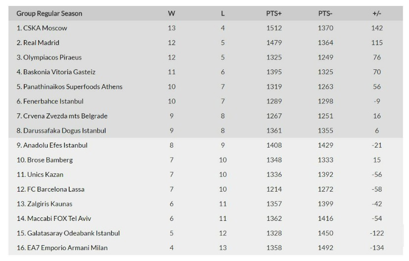Με νίκες συνέχισαν οι ελληνικές ομάδες στη Euroleague. Στην κορυφή της κατάταξης παραμένει η ΤΣΣΚΑ Μόσχας, με τον Ολυμπιακό να βρίσκεται στη 2η θέση μαζί με τη Ρεάλ Μαδρίτης και τον Παναθηναϊκό στην 5η μαζί με τη Φενέρμπαχτσε.
