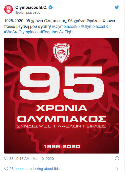 «1925-2020: 95 χρόνια Ολυμπιακός, 95 χρόνια Θρύλος! Χρόνια πολλά μεγάλη μου αγάπη!» ανέφερε στην ανάρτησή της η ομάδα μπάσκετ του συλλόγου.
