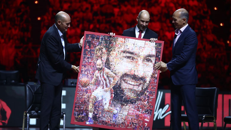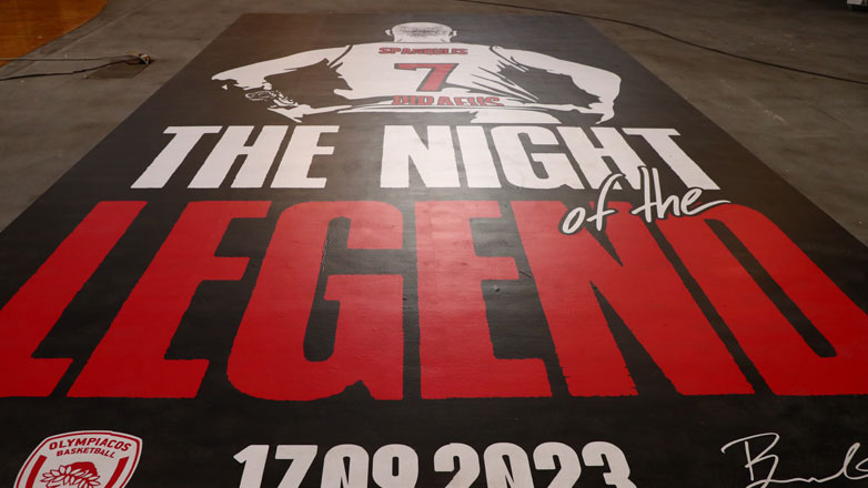 Με χαμηλό φωτισμό ερυθρής απόχρωσης περιμετρικά στις κερκίδες και στα πρόσωπα των φιλάθλων του Ολυμπιακού, αλλά τους προβολείς στραμμένους στο κέντρο του γηπέδου, όπου είχαν τοποθετηθεί πέντε καρέκλες, ξαναπάτησε στο παρκέ του Σταδίου Ειρήνης και Φιλίας ο θρύλος του Ολυμπιακού Βασίλης Σπανούλης.