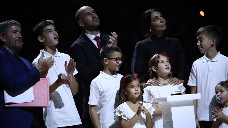 Η σύζυγός του, Ολυμπία Χοψονίδου, και τα έξι παιδιά τους πέρασαν στο παρκέ και όλοι μαζί είδαν τη φανέλα του εμβληματικού αρχηγού στην πρόσφατη Ιστορία του Ολυμπιακού, με το Νο 7, ν’ ανεβαίνει στον ουρανό του ΣΕΦ, πρώτη φανέλα που αποσύρει ο μπασκετικός Ολυμπιακός από την ίδρυσή του.