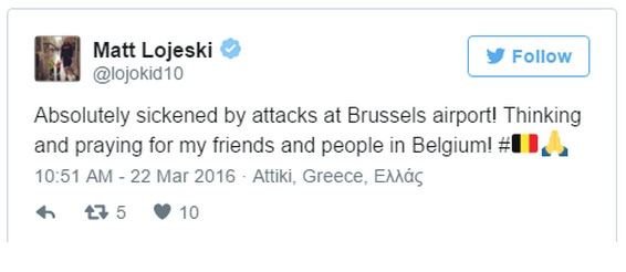 Οι τρομοκρατικές επιθέσεις στις Βρυξέλλες σόκαραν τον Ματ Λοτζέσκι, ο οποίος έσπευσε να εκφράσει – μέσω Twitter- τη λύπη και την ανησυχία του για τους δικούς του ανθρώπους στο Βέλγιο.
