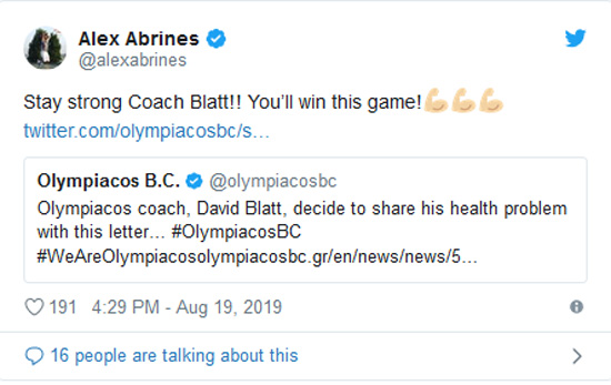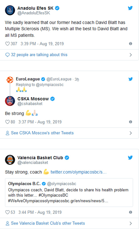 «Η οικογένεια της Μακάμπι Τελ Αβίβ εύχεται στον Ντέιβιντ Μπλατ, έναν από τους κορυφαίους προπονητές της ιστορίας της, να είναι υγιής, να αντέξει και να συνεχίσει να έχει επιτυχίες. Μείνε δυνατός» ανέφερε το “tweet” της ομάδας του Ισραήλ.